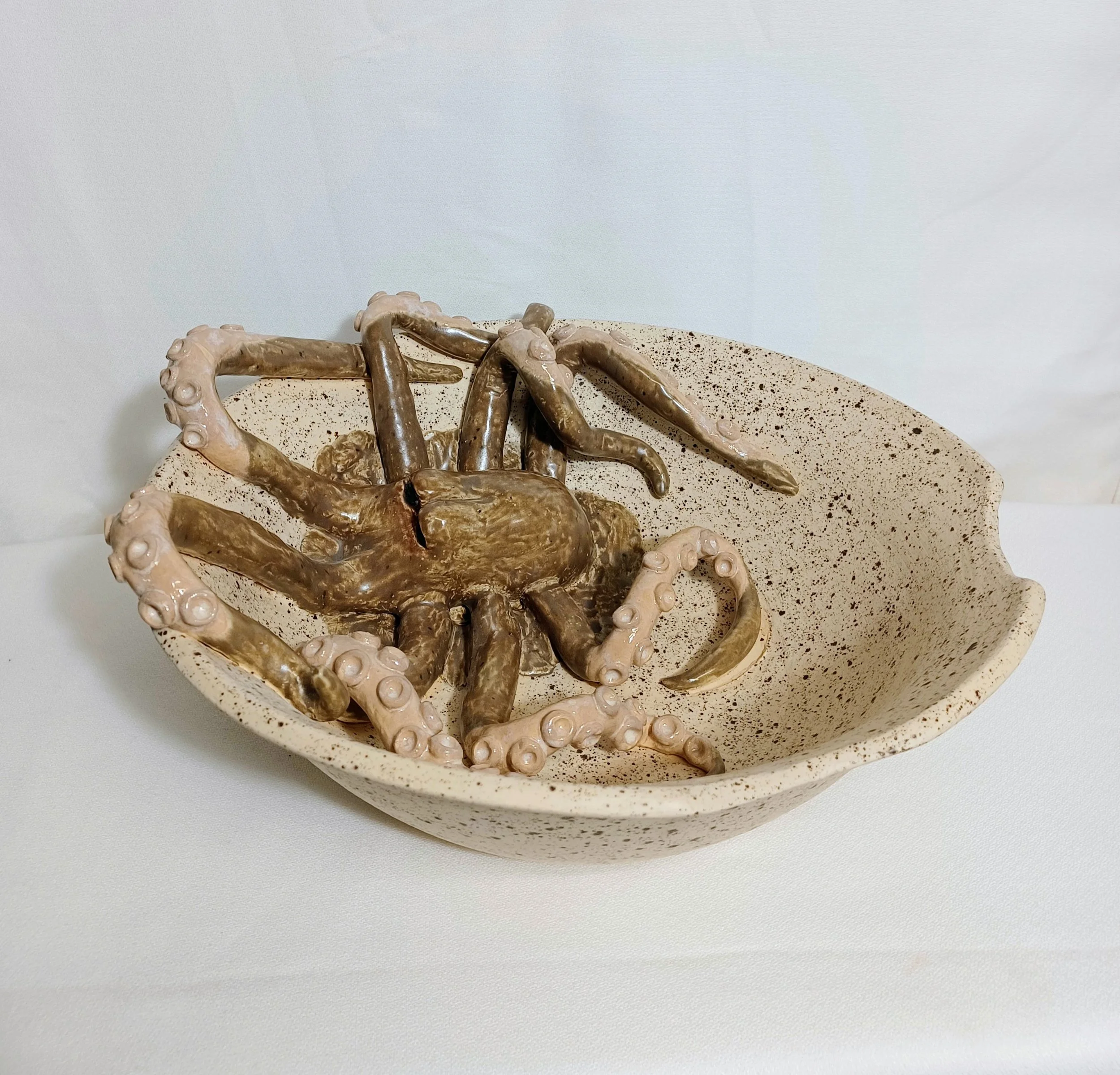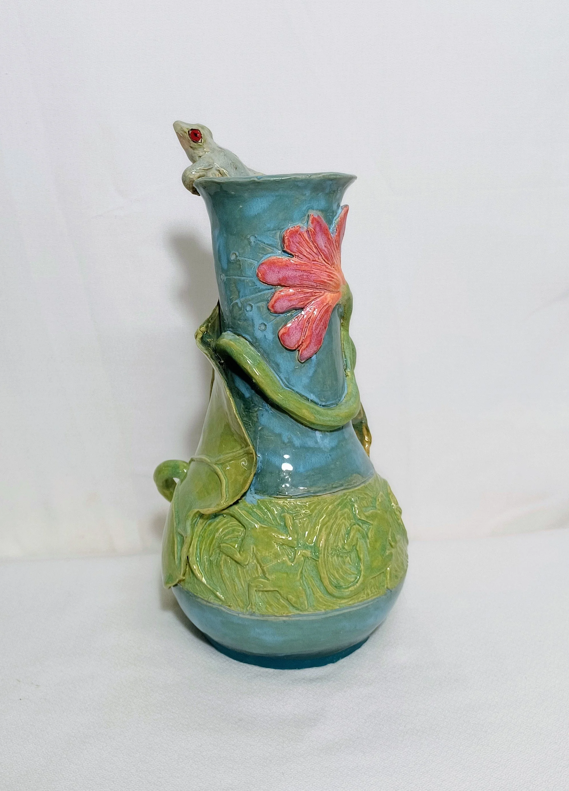 Each piece was wheel thrown by one artist then handed off to another artist who altered it by carving or attaching hand-built elements and then glazing the piece. The results were these beautiful masterpieces. It was an exciting, challenging, wonderful experience; one we hope to do again.